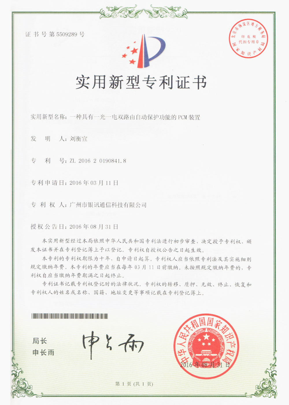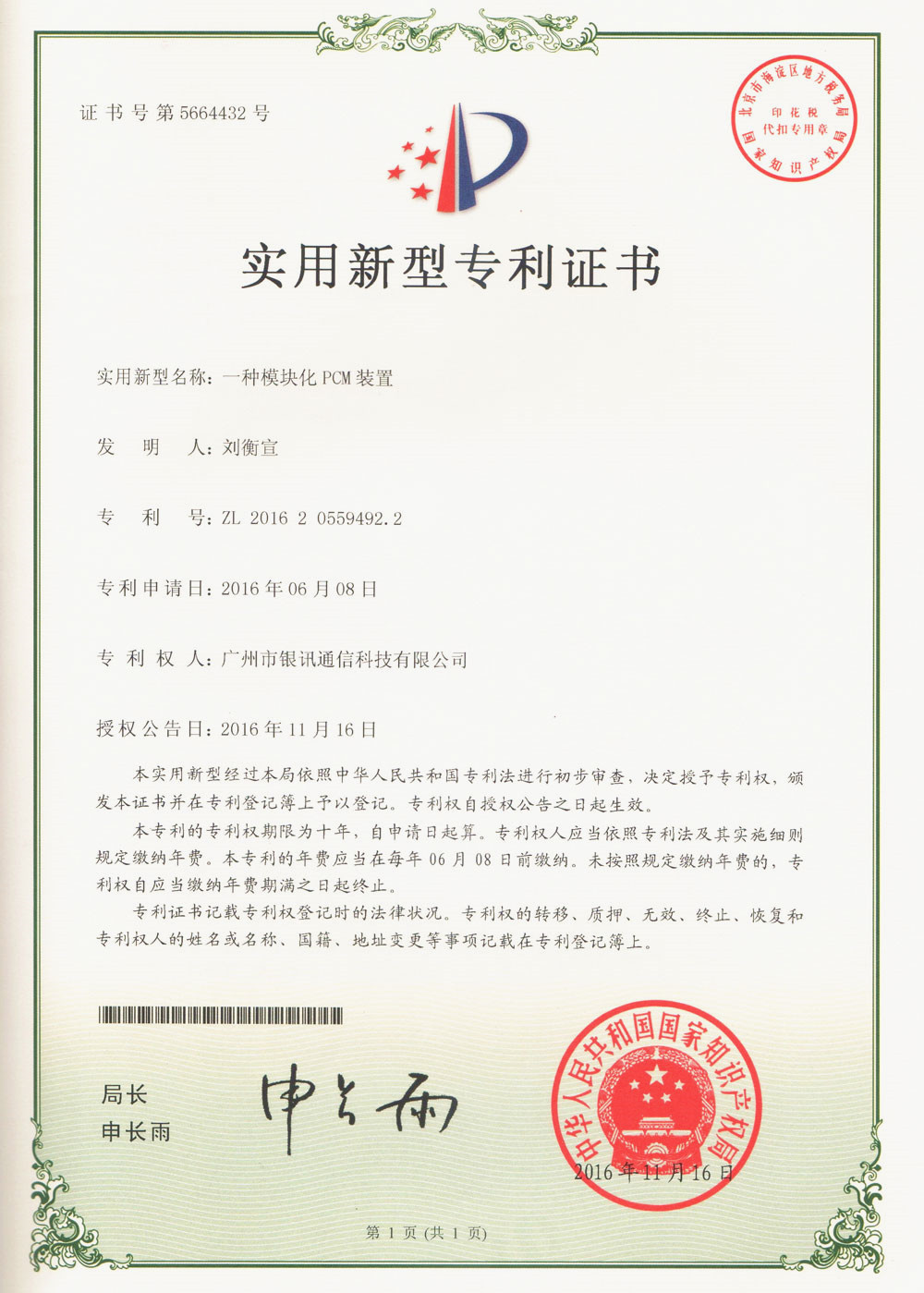 國家專利證書