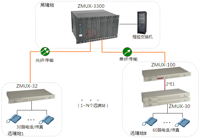 遠(yuǎn)端N的ZMUX-30接入60路電話(可選配其它業(yè)務(wù))復(fù)用成2路E1信號(hào),通過(guò)E1接口(2M接口)級(jí)聯(lián)ZMUX-100,再轉(zhuǎn)換成光信號(hào),通過(guò)光纖傳輸?shù)綄?duì)端去。