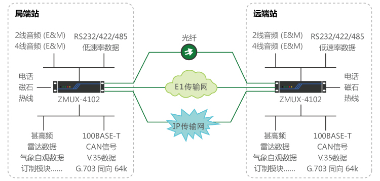 基于IP專線、光纖線路、E1 線路自動切換:遠(yuǎn)端站到局端之間,租用運營商IP專線與E1線路、光纖線路,通過接入ZMUX-4102平臺,完成IP專線與E1線、光纖線路自動切換功能,保障甚高頻、雷達(dá)數(shù)據(jù)等業(yè)務(wù)的安全可靠性傳輸。